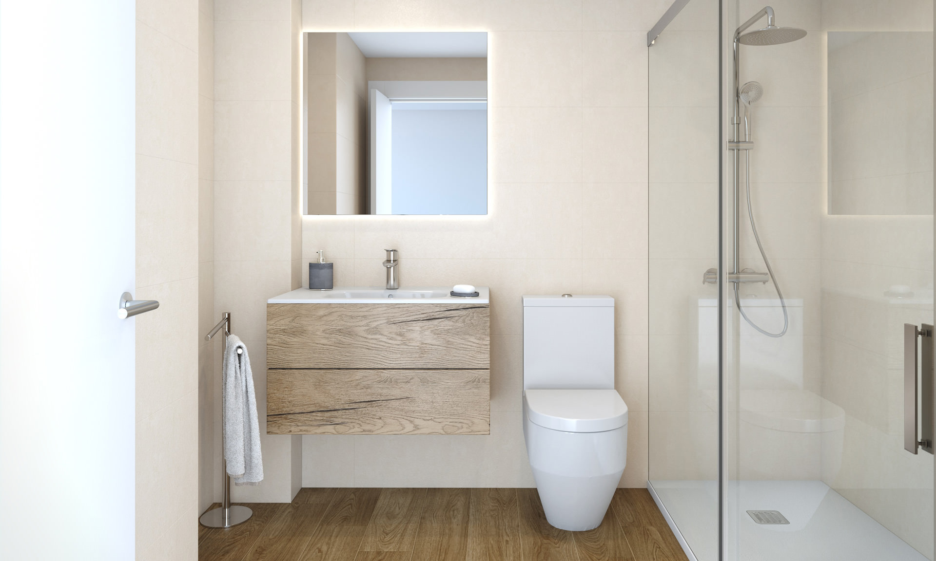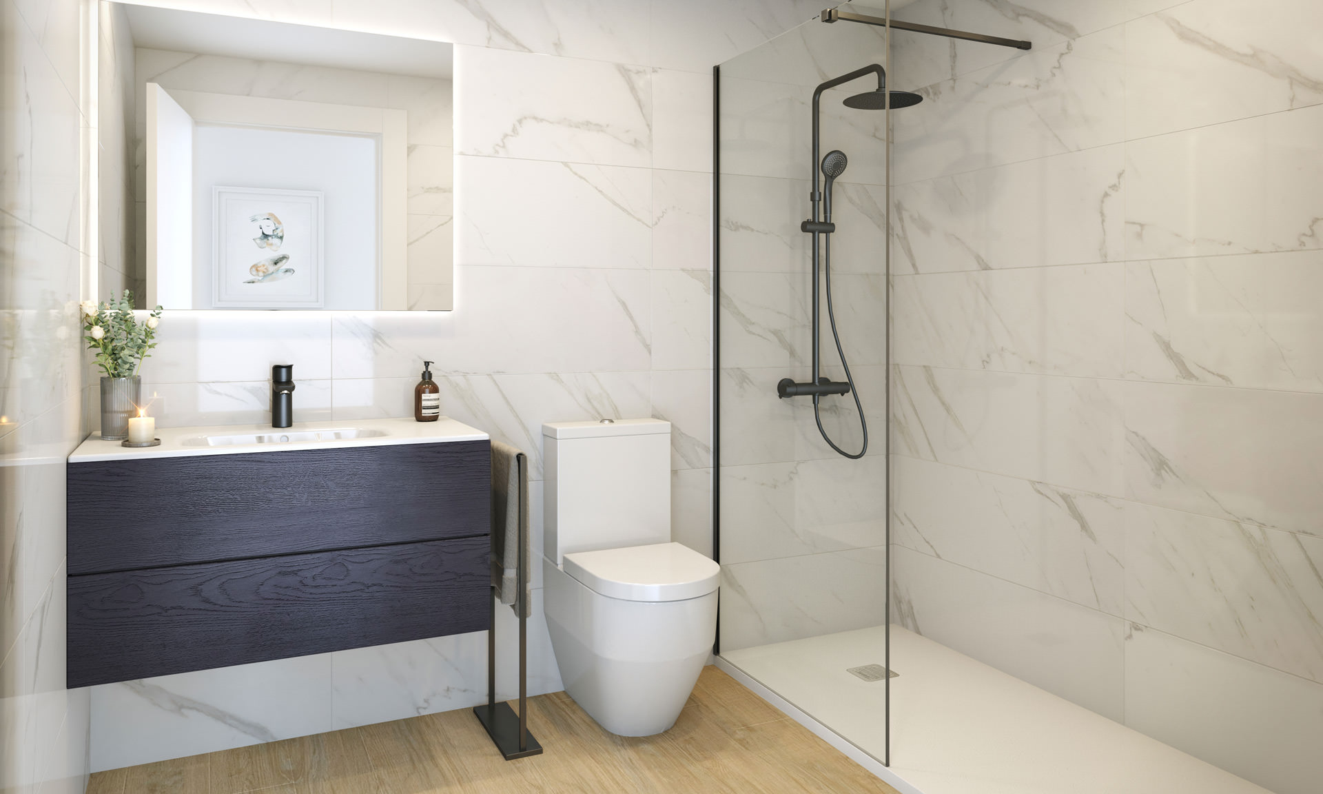 • Baño principal: revestimiento de cerámica rectificada de gran formato, varios modelos a elegir.