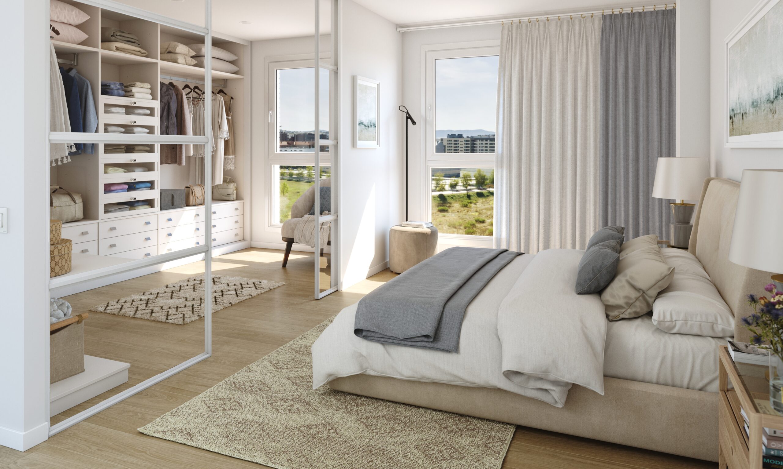 • Armarios empotrados a medida, con puertas abatibles lacadas en blanco.